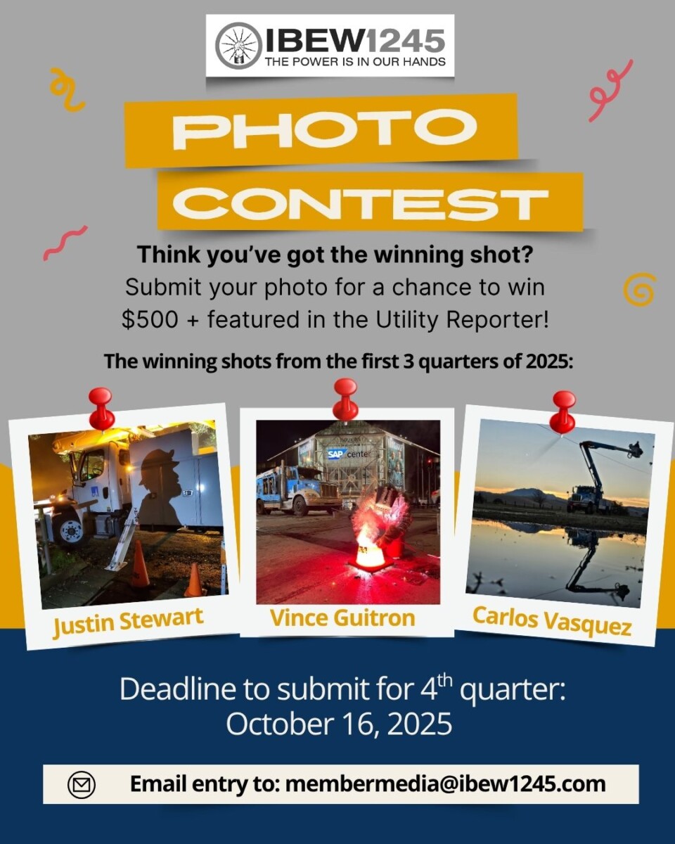 The 4th Quarter IBEW 1245 Photo Contest is now open! Members are invited to showcase their skills behind the lens by submitting high-resolution, safety-compliant photos that capture the pride, solidarity, and hard work of our union.