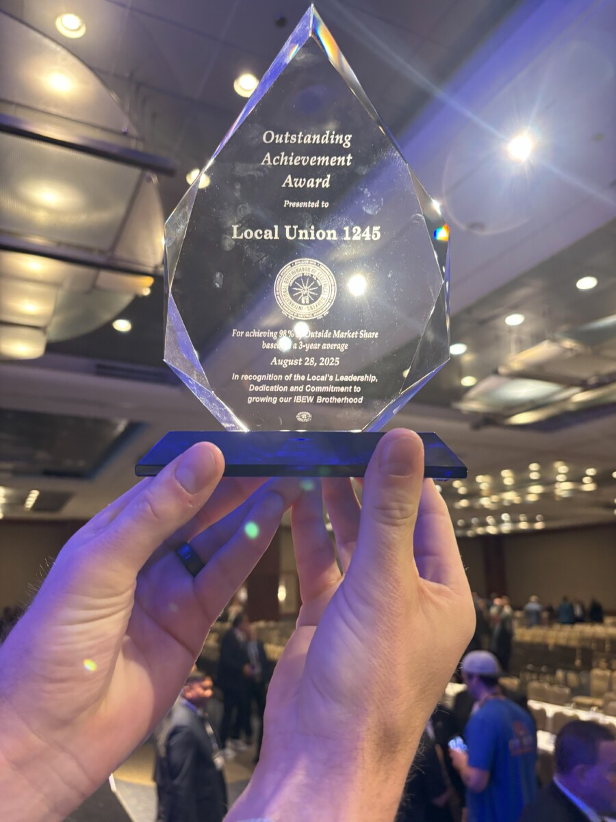 IBEW 1245 stood out among the locals in attendance, receiving the Outstanding Achievement Award for achieving 98% Outside Construction Market Share (meaning nearly all outside line construction in our jurisdiction is done union).