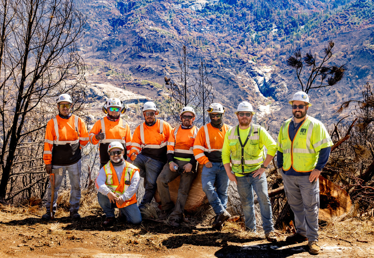 IBEW 1245 tree crews from Arbor Works at the Garnet Fire burn zone in the Sierra National Forest. These crews are removing hazard trees to restore safe access and protect power lines. Kneeling in front: Arbor Works Field Foreman Hugo Uribe.