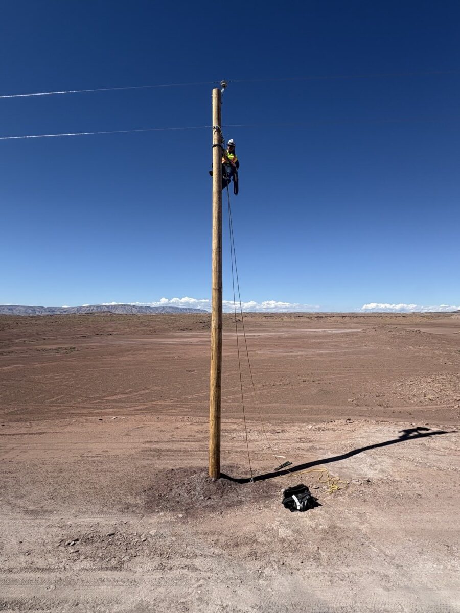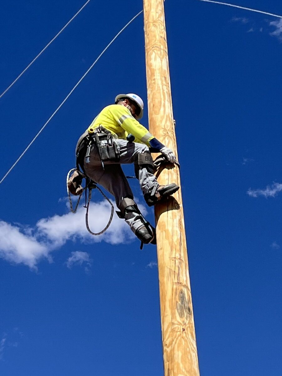 One of our IBEW 1245 linemen works his way up the pole on the Navajo Nation. Each step brings us closer to connecting families to electricity for the very first time.