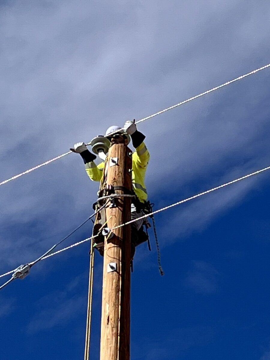 Careful hands at the top of the pole — PG&E linemen from IBEW 1245’s first deployment make the final connections to bring power to Navajo homes.