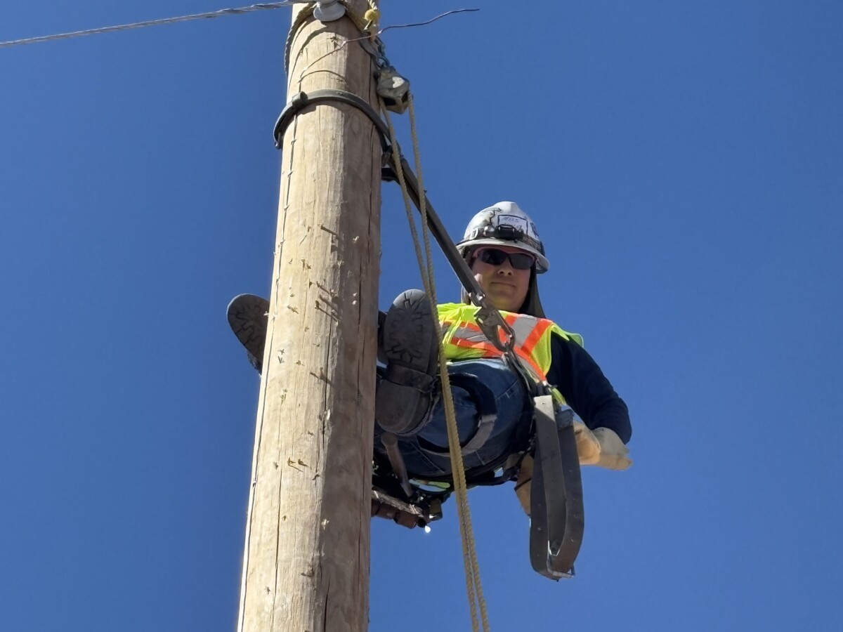 An IBEW 1245 lineman takes a breather mid-climb while volunteering with Light Up Navajo — helping bring electricity to families who’ve never had it before.