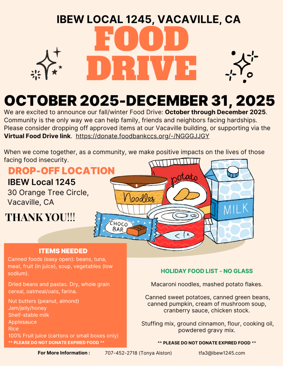IBEW 1245 has officially launched its Fall/Winter Food Drive, running now through December 31, 2025.