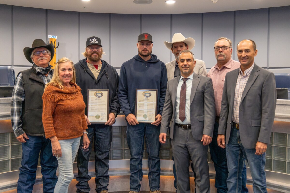 IBEW 1245 members and Modesto Irrigation District lineworkers Jimmy Boere and Brian Szuggar were honored by the MID Board of Directors for their heroic actions rescuing a man trapped in a submerged truck in a Modesto canal. Pictured with MID leadership and Board members following the presentation of a Resolution of Commendation recognizing their courage and quick response.