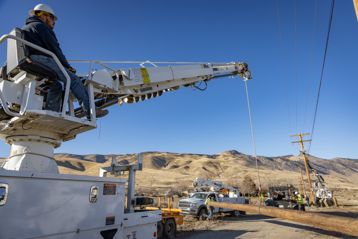 From left to right: Dale Flux, journeyman lineman; Quaylan Jones, lineman apprentice; Cameron Zubiri, line equipment man and Jeremy Smith, line foreman upgrade poles in Doyle, Calif.
