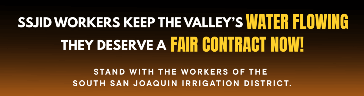 Carrying signs and standing shoulder-to-shoulder in the early morning hours, the workers — including division managers, maintenance workers, equipment operators, mechanics, and water treatment operators — demanded that SSJID management stop slow-walking negotiations and start valuing the workforce that delivers water to Valley farms, families, and businesses.